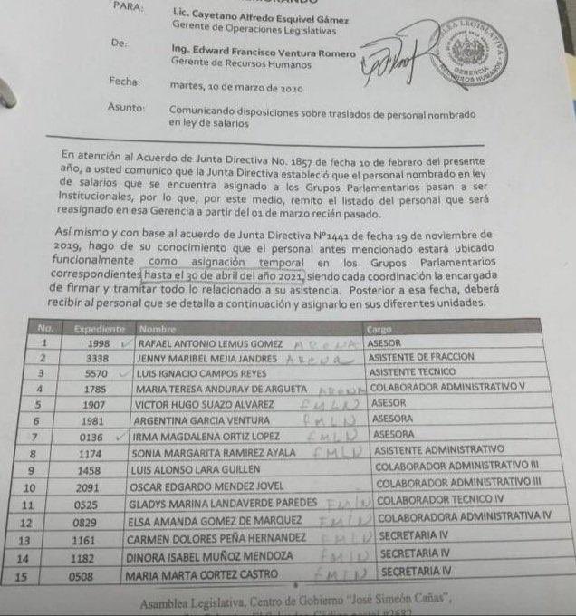 Luego de conocerse un documento de Junta Directiva de la Asamblea Legislativa donde se establecen traslados de personal de Ley de Salarios de los grupos parlamentarios al área institucional, el diputado suplente del FMLN, Víctor Hugo Suazo, y el economista Rafael Lemus respondieron a los señalamientos hechos por el ministro de Hacienda, Alejandro Zelaya.